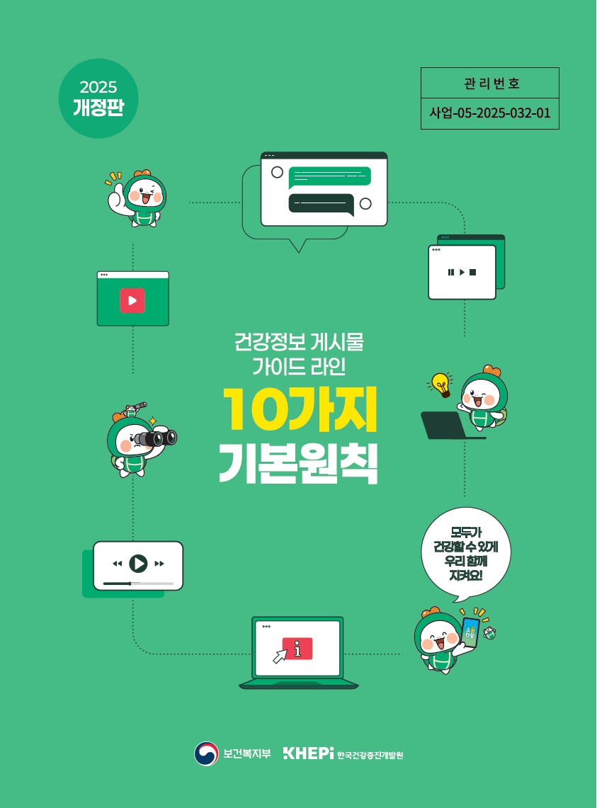 2023년 한국건강증진개발원에서 발간된 건강정보 게시물 가이드라인을 개정한 "건강정보 게시물 가이드라인 10가지 기본 원칙" 입니다.